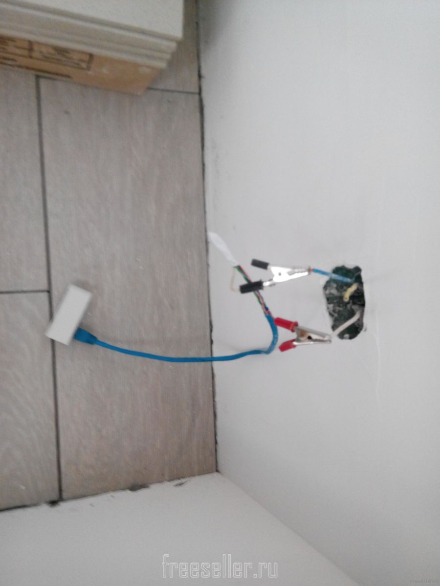 Подключение к тестеру разрезанным кабелем RJ45 к 2 проводам 1 кабеля). Для удобства крокодильчики неплохо было бы одеть и на них, но у меня их было только 2.