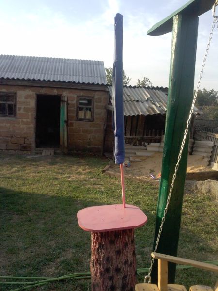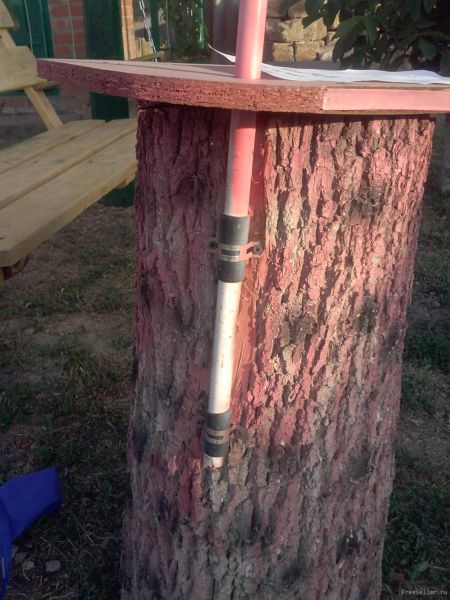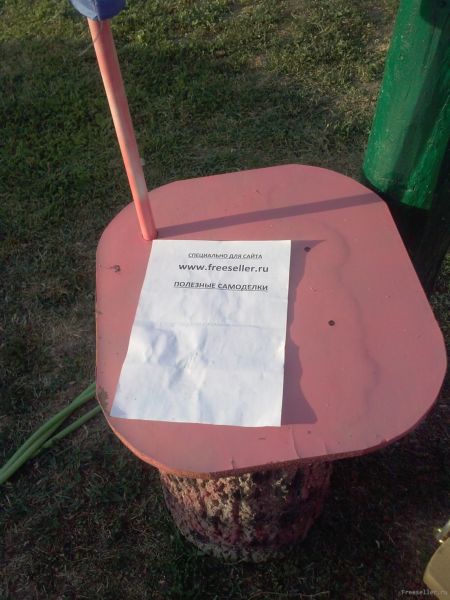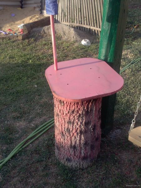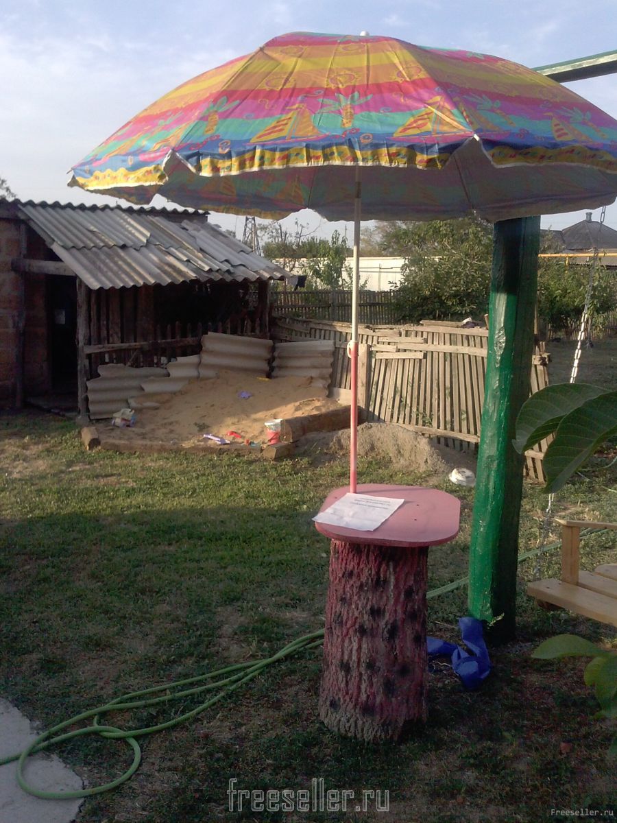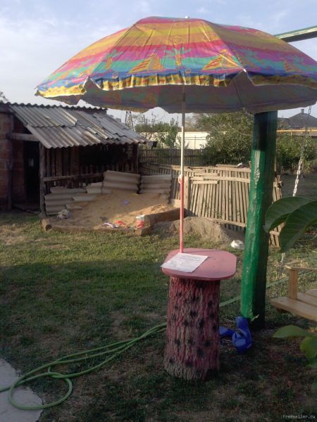 Однажды, проезжал мимо лесопосадки увидел большой спиленный пень на обочине дороги и решил его забрать. В хозяйстве всегда пригодиться. Сначала думал сделать из него простой столик для рубки на нём топором, но в один солнечный день возникла необходимость установить большой зонтик от солнца и вот тут и возникла такая идея, сделать столик со встроенным зонтиком, так как вес у пенька большой, следовательно ветром зонтик не унесет. К сожалению самого процесса изготовления нет, но на фотографиях ниже все думаю и так понятно.