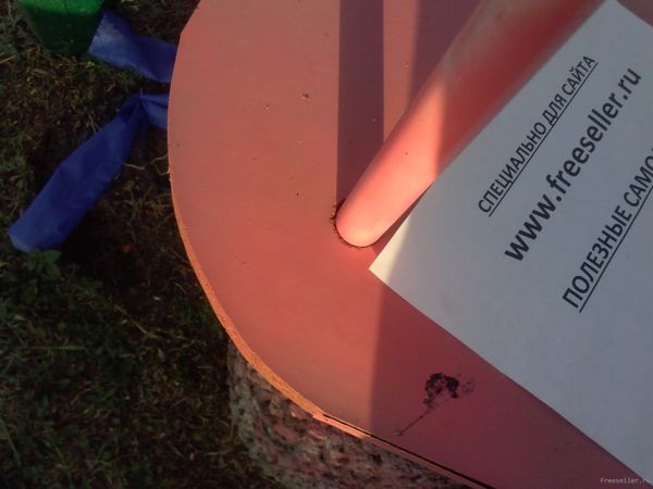 Далее просверлил в ней отверстие, такое, что бы свободно проходила стойка зонтика: