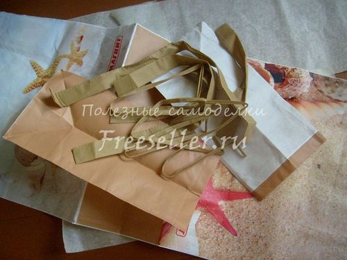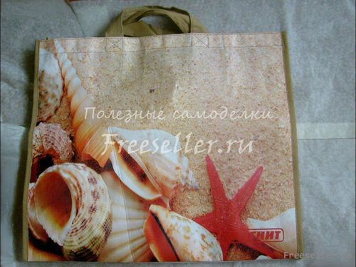 Огромные хозяйственные сумки не самого презентабельного вида, зато прочные, продаются в любом супермаркете. Стоят они недорого, хотя бывают и очень неплохой расцветки. Из такой сумки можно легко и быстро смастерить элегантный пакет для покупок.