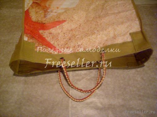 8. Вдеваем шнур в отверстия. Концы изнутри связываем в узел. Ручки готовы.