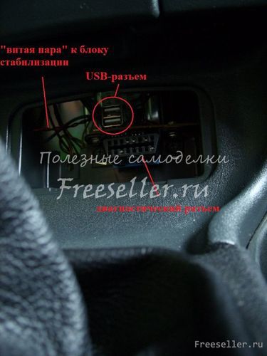 И наконец, возник вопрос: где установить разъем и блок стабилизации напряжения, что бы не пришлось далеко тянуть провода, и чтобы питание рядом было. Решил, что нет лучше места, чем ниша под диагностический разъем на центральной консоли. Надо сказать, что не пришлось сверлить на панели ни одного отверстия! Чему я очень рад! Получилось так.