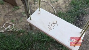 Сначала из фанеры вырезаем сидушку для качели и досточки для перемычек. Размер можно взять любой. Затем в каждой перемычке и сидушке просверливаем отверстия по краям.
