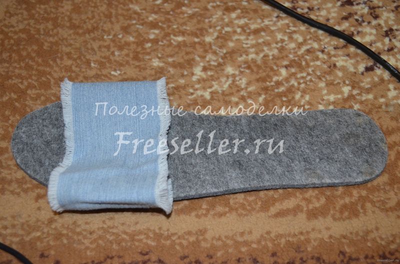Затем пришиваем эти полоски к стелькам. Сшиваем посередине ленточкой. Готово!!! Такие шлепанцы отлично смотрятся на ножке и подойдут для ношения как сильному, так и слабому полу. Надеюсь, моя самоделка была вам полезной!!!