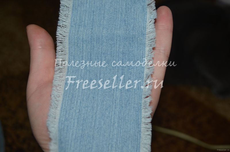 Берем джинсы и вырезаем прямоугольник (примерно двадцать на пятнадцать сантиметров, в зависимости от ширины ножки), после разрезаем его на две части, у нас должны получиться две полоски. Ширина полосок - на ваше усмотрение.