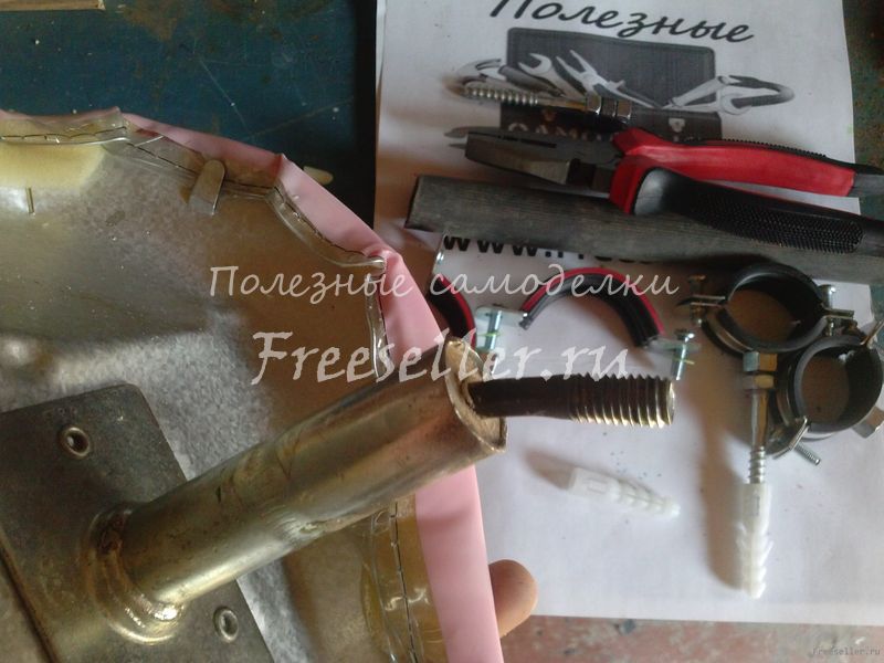 Теперь просверливаем в нем отверстие и вставляем металлический держатель от хомута: