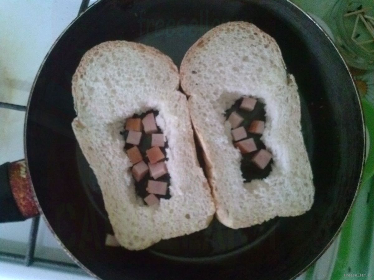 На разогретую сковороду ложим хлеб и в серединку насыпаем немного колбасы.