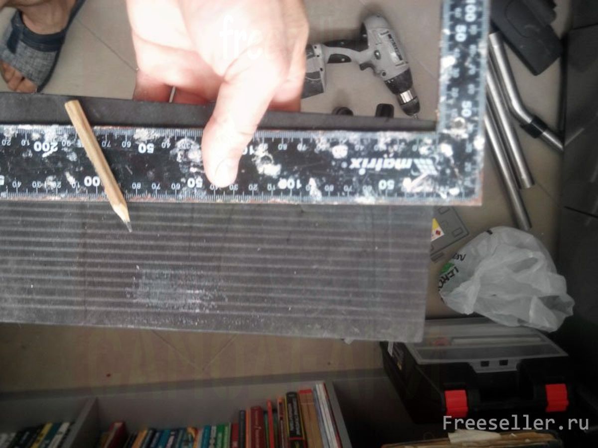 По предварительно нанесенной разметке. Прикладываем угольник, прижимаем его 2-мя маленькими зажимами и прорезаем 1-ю и последующие линии канцелярским ножом.