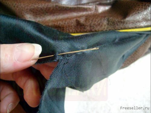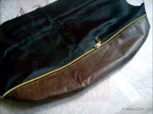 3. Сшиваем внутренние детали - тканную подкладку с дерматиновым верхом, заложив между ними половинки застёжки-молнии.