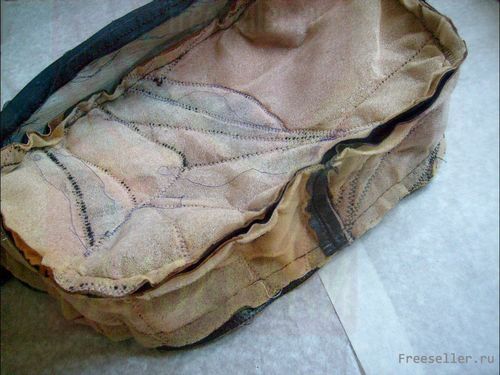 7. Сшиваем между собой детали тканной подкладки. С обеих сторон насколько можно сшиваем их с изнанки. Оставляем посередине зазор, чтобы вывернуть сумку.
