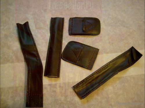 8. Из дерматина выкраиваем два коротких ремешка и четыре детали для крепления пряжек под наплечный ремень. По периметру и в центре деталей делаем проколы. Прорезаем детали над треугольной разметкой.