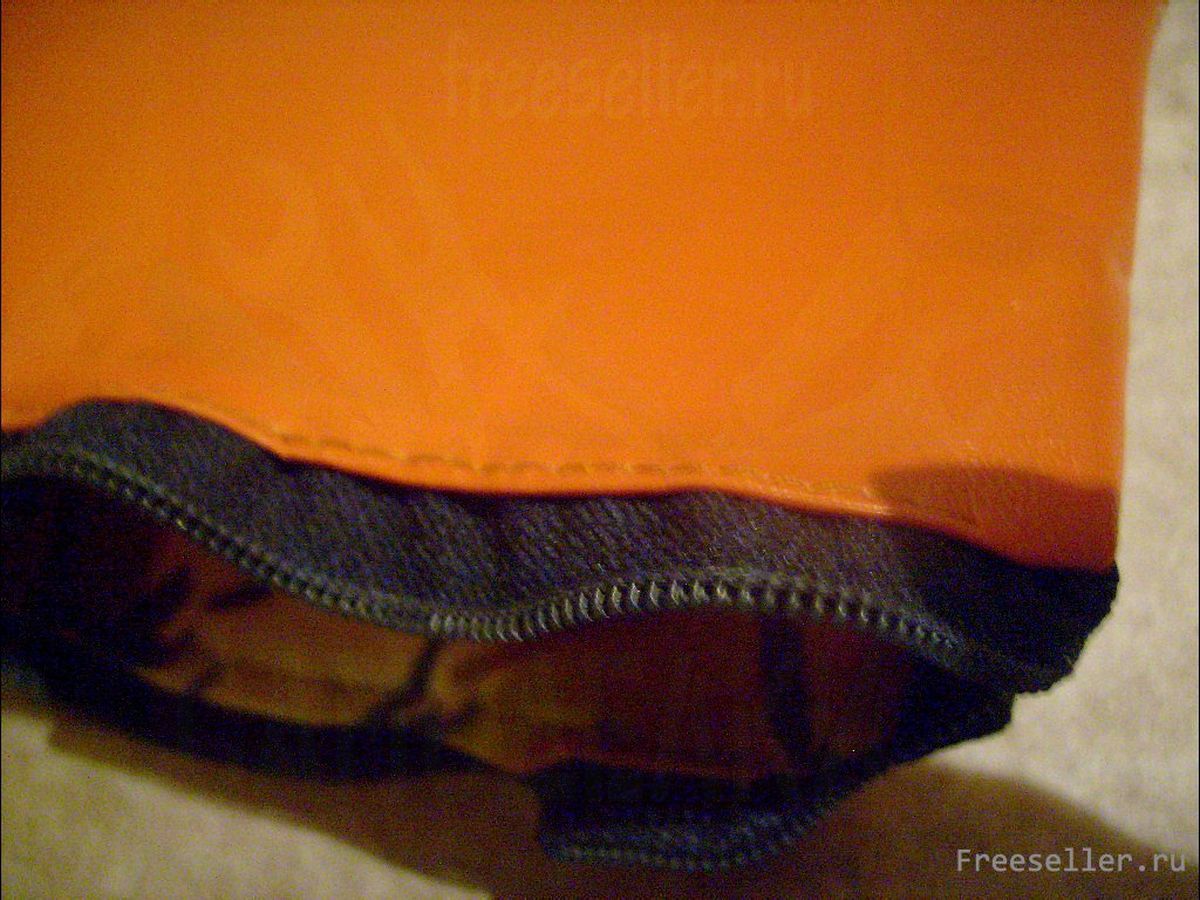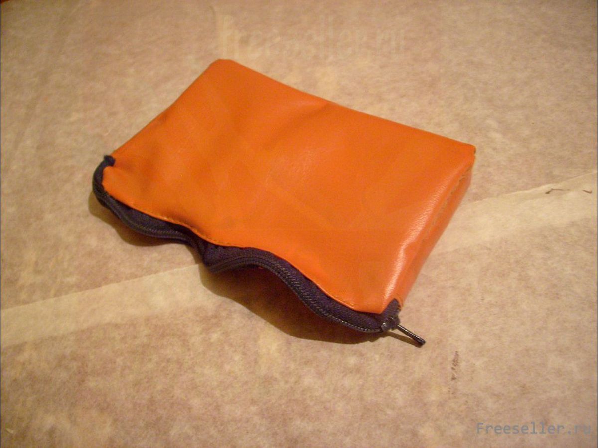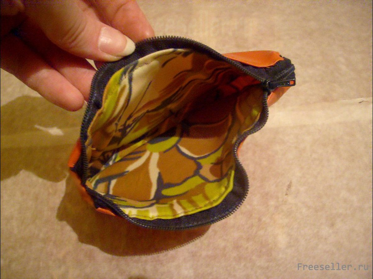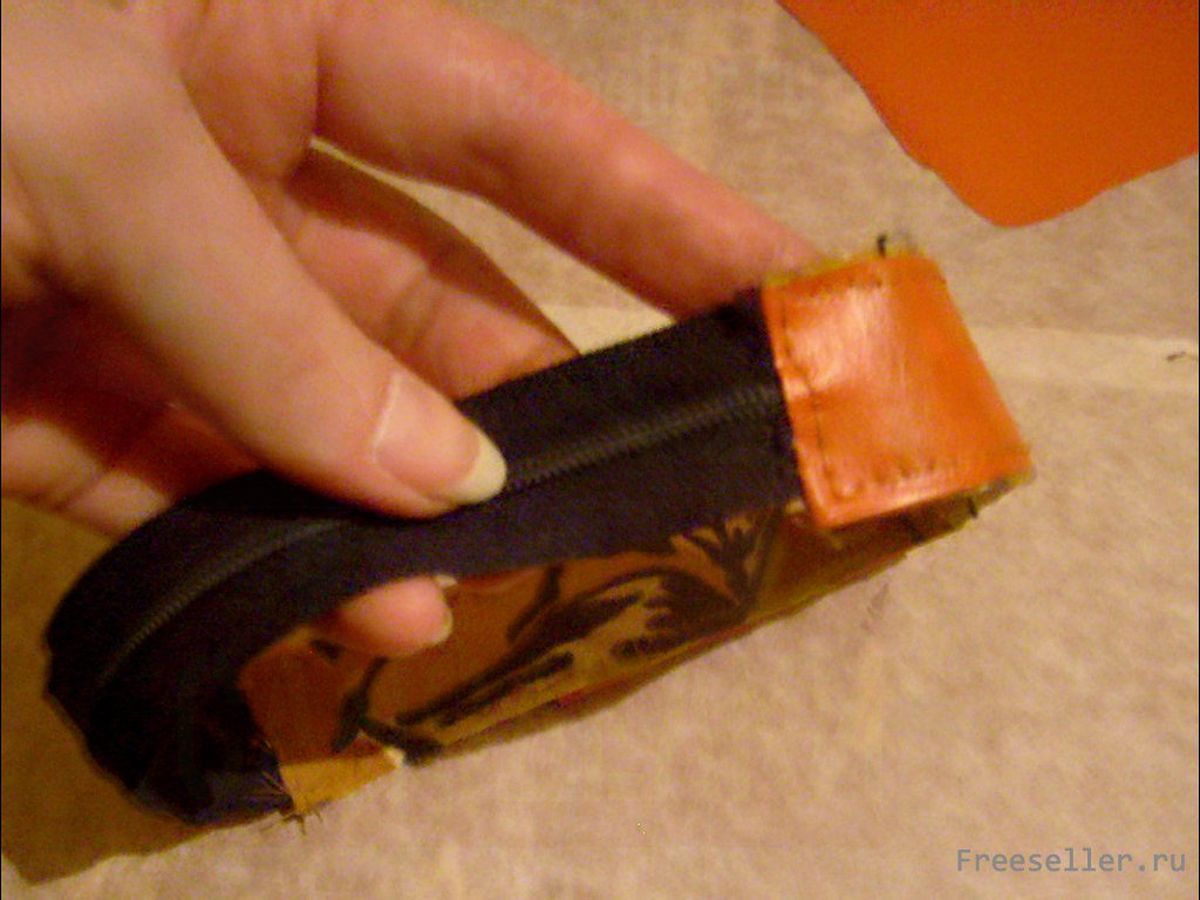 4. Складываем боковину пополам. Размечаем середину дна. Размечаем середины длинных сторон переда и спинки. Поочерёдно складываем боковину с ними, совмещая разметку, и сшиваем их с изнанки до застёжки. Выворачиваем косметичку. На участке молнии подворачиваем срезы клеёнки и ткани вовнутрь. Примётываем и прострачиваем застёжку.