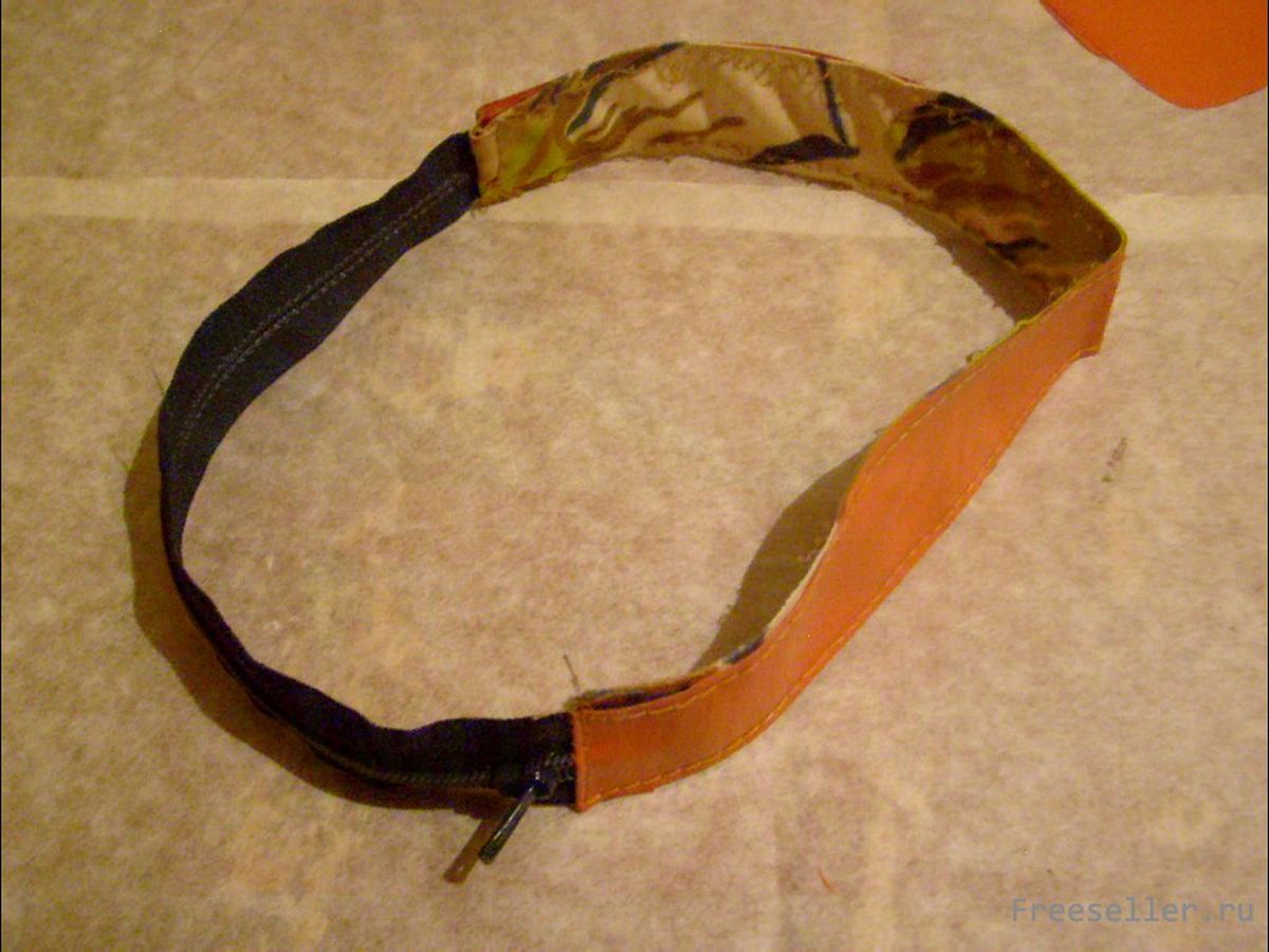 3. Сшиваем молнию с боковиной в сплошное кольцо. По очереди сшиваем короткие срезы, заложив между ними молнию. Выворачиваем деталь на лицо и прострачиваем с лицевой стороны с каждого края.