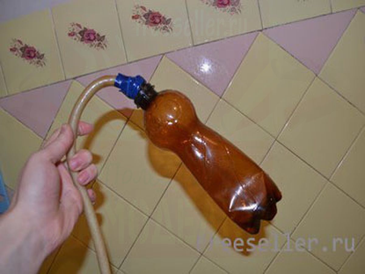 Берем эту бутылку и прикрепляем ее с помощью изоленты к шлангу.