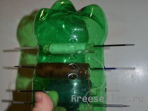 По ранее обозначенным местам на дне бутылки выжигаем отверстия;