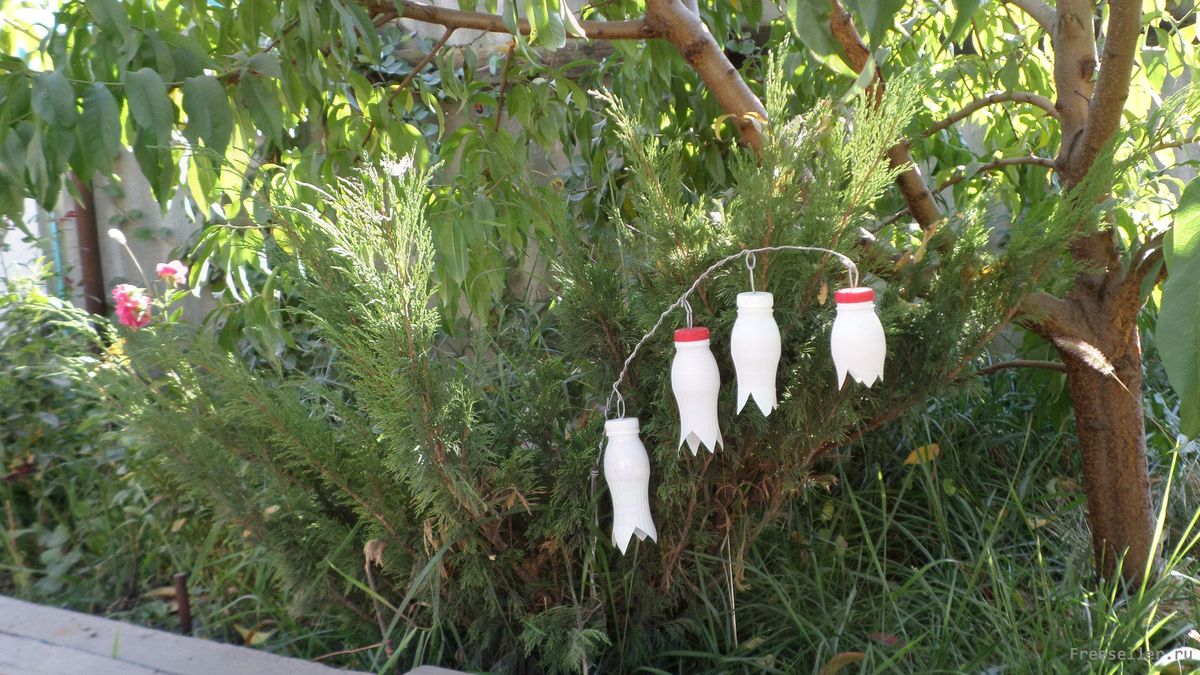 Сегодня пластиковые бутылки встречаются самые разнообразные. Для ветки цветов, которые можно сравнить с колокольчиками, купеной или хостой,выбираем самые изящные бутылочки - из-под питьевого йогурта.