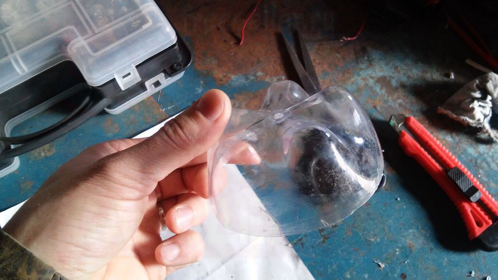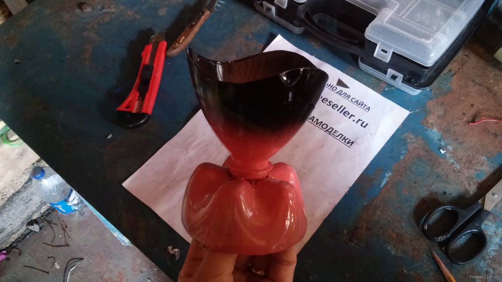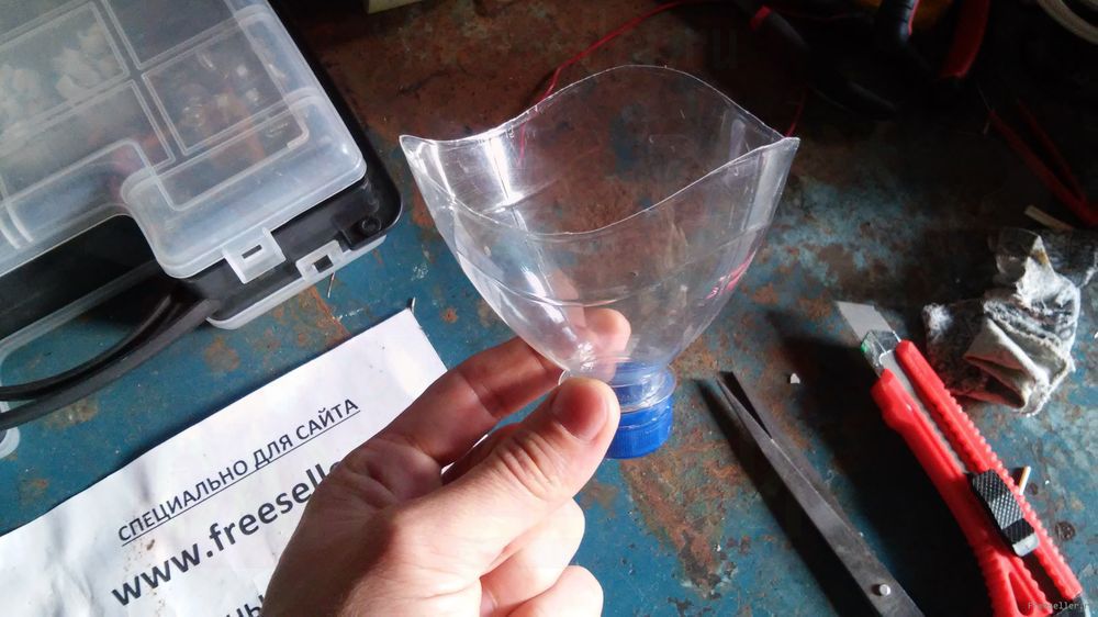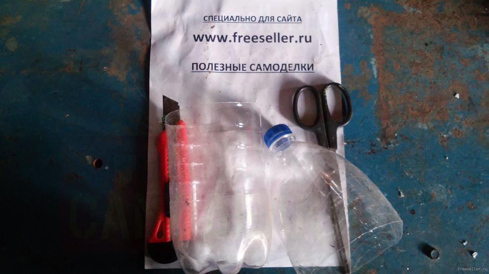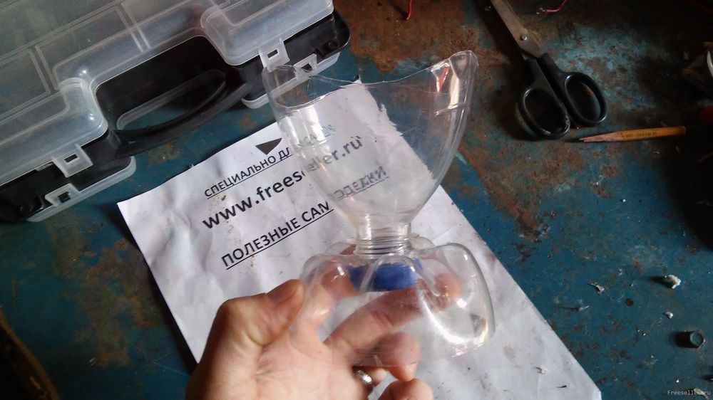 Вырезаем горлышко (идеально подходит бутылка 2,25 литра от пепси-колы, на ней выбиты изогнутые линии по которым очень удобно резать). На фото всё видно.