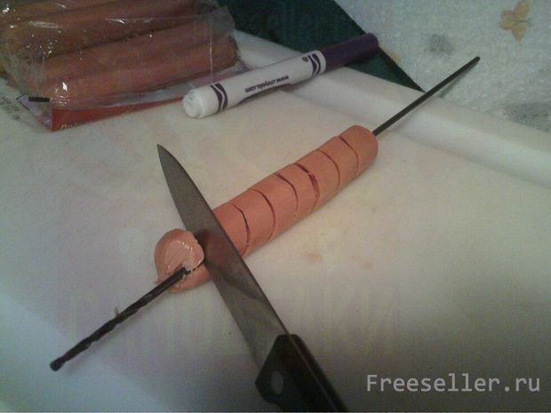 Для приготовления спиралевидных сосисок понадобится спица, можно использовать деревянную шпажку. Итак, нанизываем сосиску на спицу или шпажку и начинаем ее по спирали нарезать.