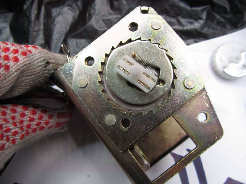 В центре зубчатого отверстия находится эксцентрик с зубцами (который заклинивает ремень при резком выдёргивании) пространство под которым нужно очистить. Для этого льём немного бензина по периметру отверстия и немного в центр, удерживая ремень от сматывания на время снимаем прищепку.