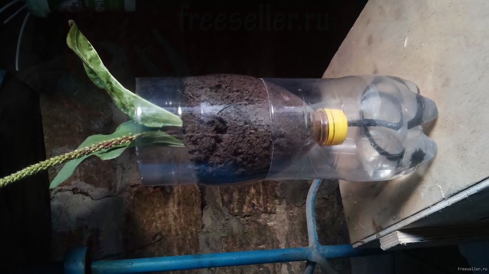 Далее в верхнюю часть бутылки сажаем нужное нам небольшое растение, а в нижнюю наливаем воду.