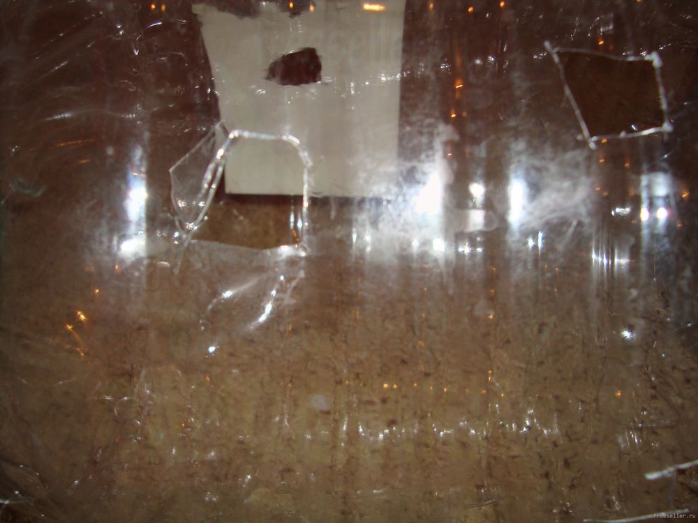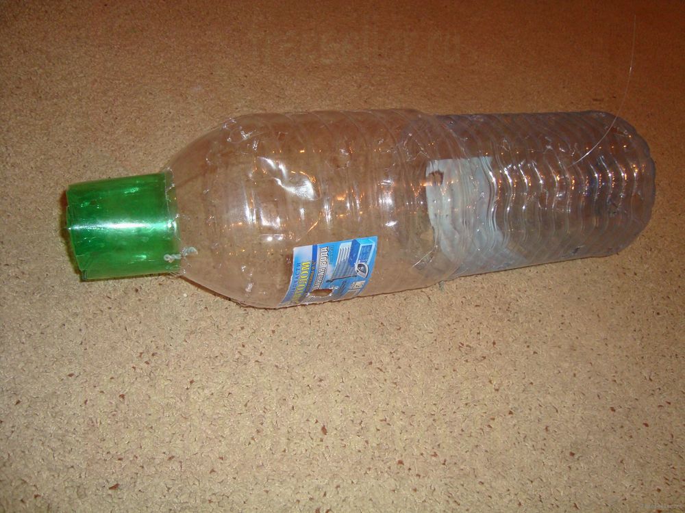 У второй бутылки отрежьте лишь верх. Резать нужно в том месте, где начинается сужение пятилитровки. Сшейте леской с первой бутылкой.