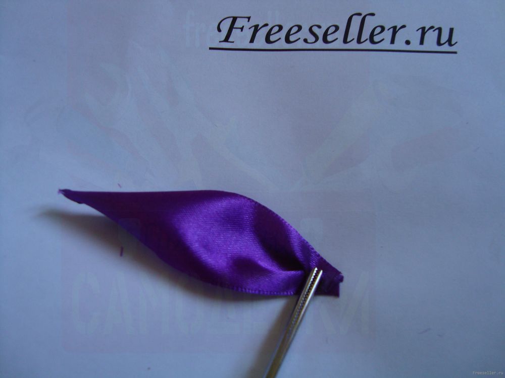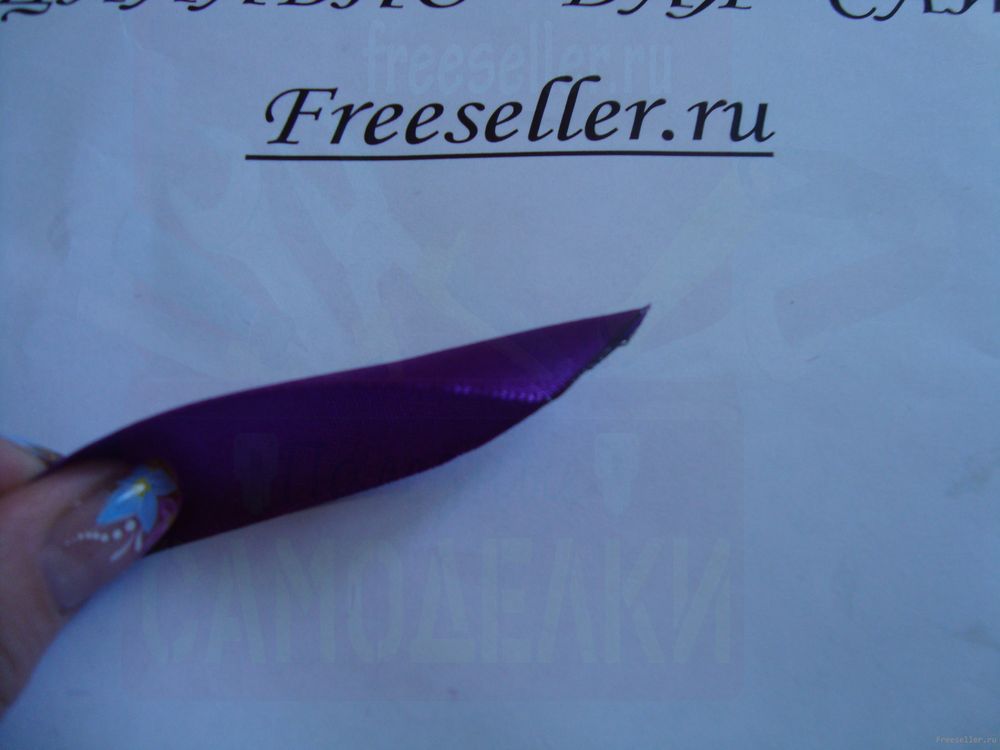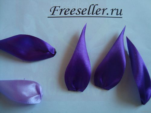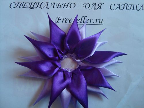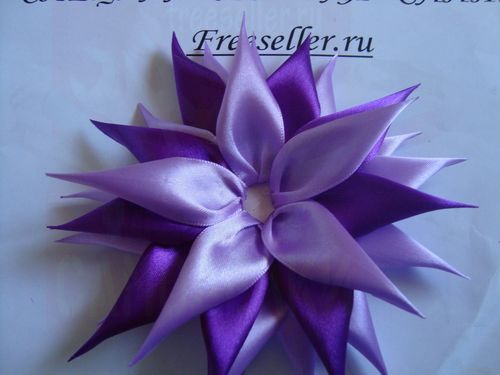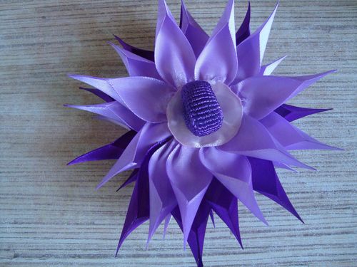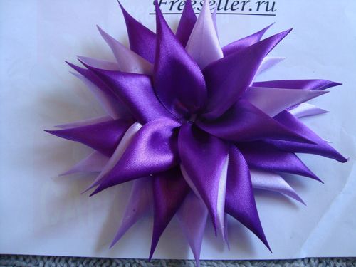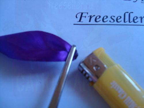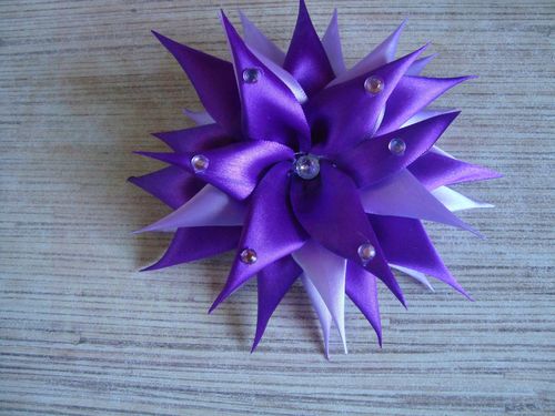 Для создания остроугольного пышного цветка вам понадобится атласная лента сиреневая, шириной которая - 2.5 см около полутора метров и 1 метр лента фиолетовая тоже узкая. Еще приобретите клей, хорошо, если у вас есть специальный пистолет с клеевыми стержнями, но если нет - тоже не беда, тогда воспользуйтесь "Момент Кристалл". Он отлично зафиксирует листики и не испачкает работу, еще, что немаловажно, этот клей не имеет неприятного запаха. Для придания острой формы лепесткам нужна зажигалка. И последнее, что Вам надо подготовить - это красивую бусинку или страз.