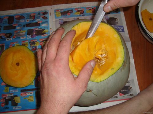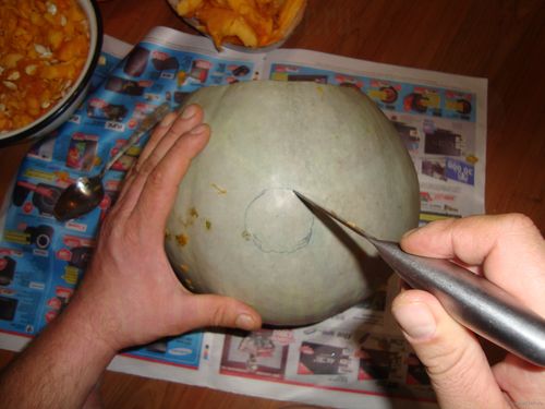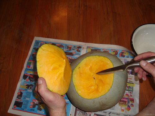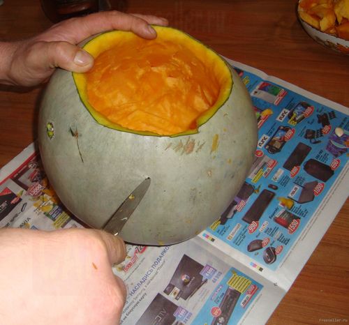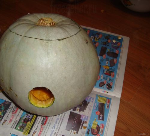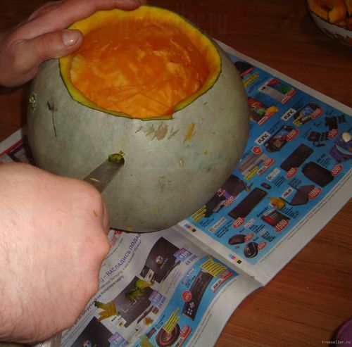 Затем нужно достать все семечки с мякотью. с помощью железной ложки вышкребите побольше мякоти. Этот дом не только укроет птиц от непогоды, но и в начале прослужит отличной кормушкой.