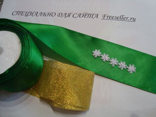 Нарежьте из тесьмы белые цветы и украсьте ими елочку.