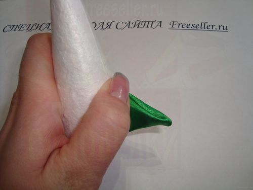 Возьмите конус и с помощью клея начинайте фиксировать зеленые "лапы" ели.