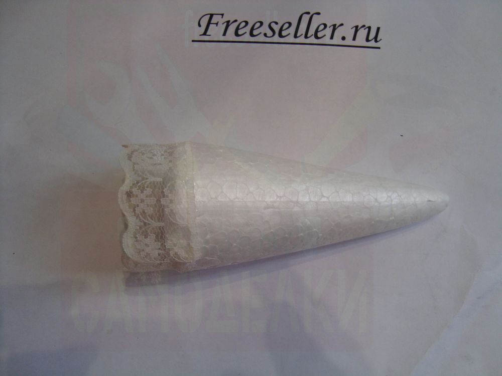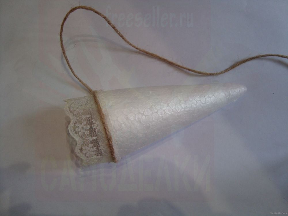 На первом этапе конус нужно обмотать лоскутом или кружевной бейкой, это получится ажурная юбка у будущей елки.