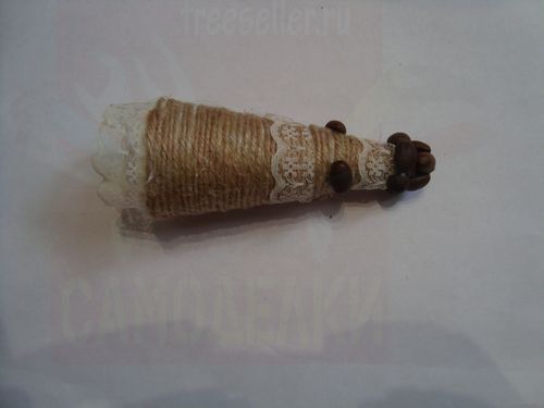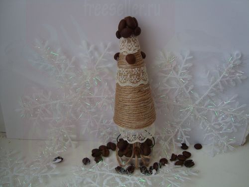 В данном варианте бечевка подходит больше нежели другие веревки, ведь она напоминает старинные русские поделки из мешковины. Эта елочка сочетает в себе и старину и новаторство.
