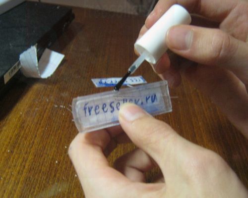 Идем дальше, и тут наверное, как все догадались, мы берем те самые две разделенные части, складываем их, а между ними вставляем нашу бумажку и мажем грани лаком чтобы "склеить" их. Желательно чтобы пластмасса была ровной, чтобы лак не попал во внутрь.