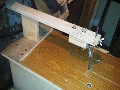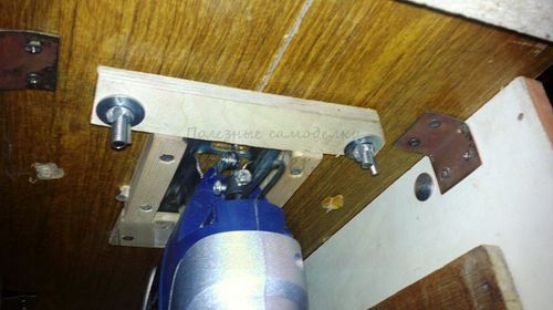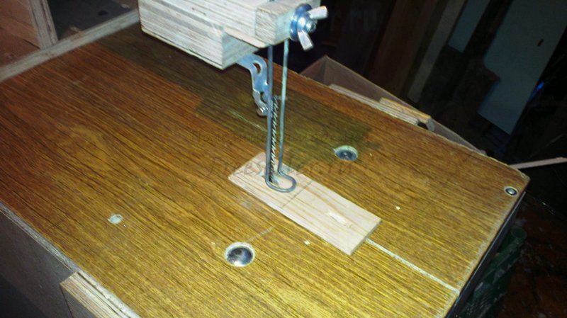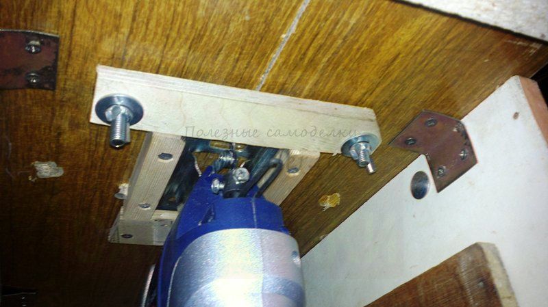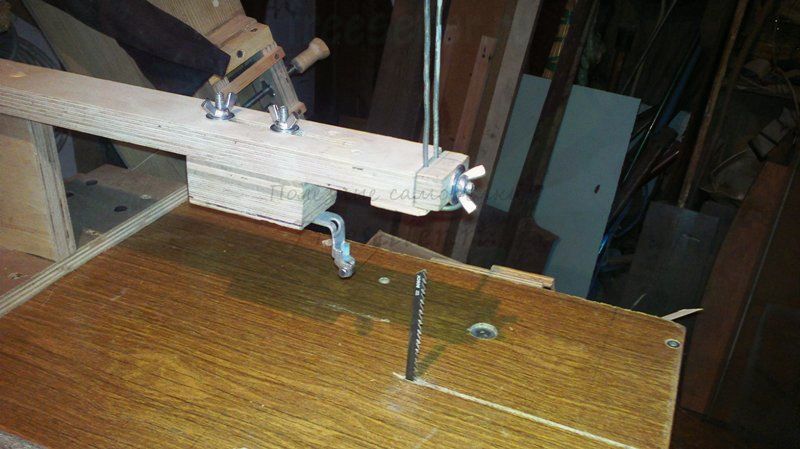 Крепление лобзика снизу планками из фанеры. Для возможности снятия передняя планка на мебельных болтах с барашками.