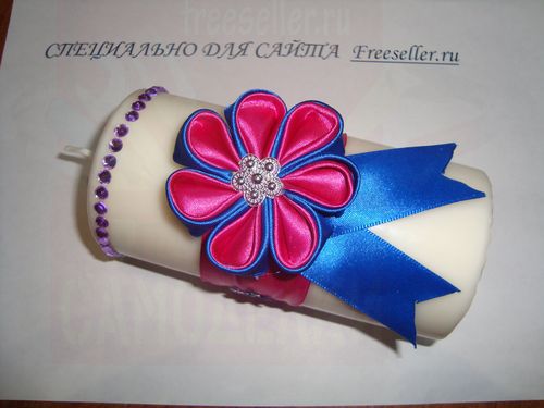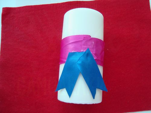 На свечку атлас не приклеится, поэтому оберните ее и заклейте края матери между собой.