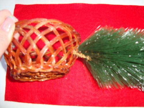 В маленькую конфетницу вставьте лапы ели и украсьте их.