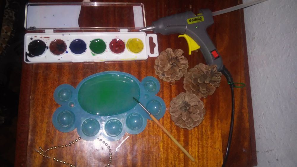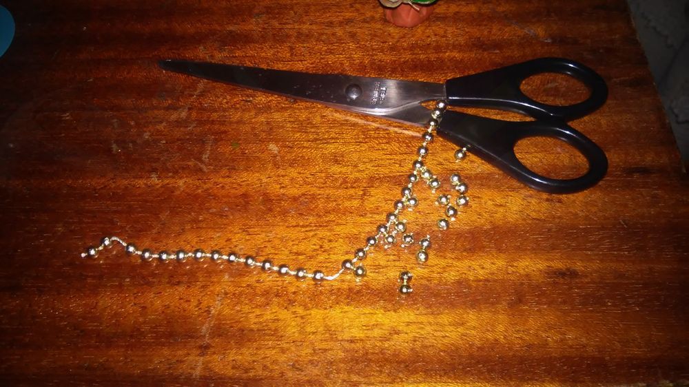 Далее отрезаем по одному шарику от бус и приклеиваем их при помощи термо-пистолета к нашей "елочке".