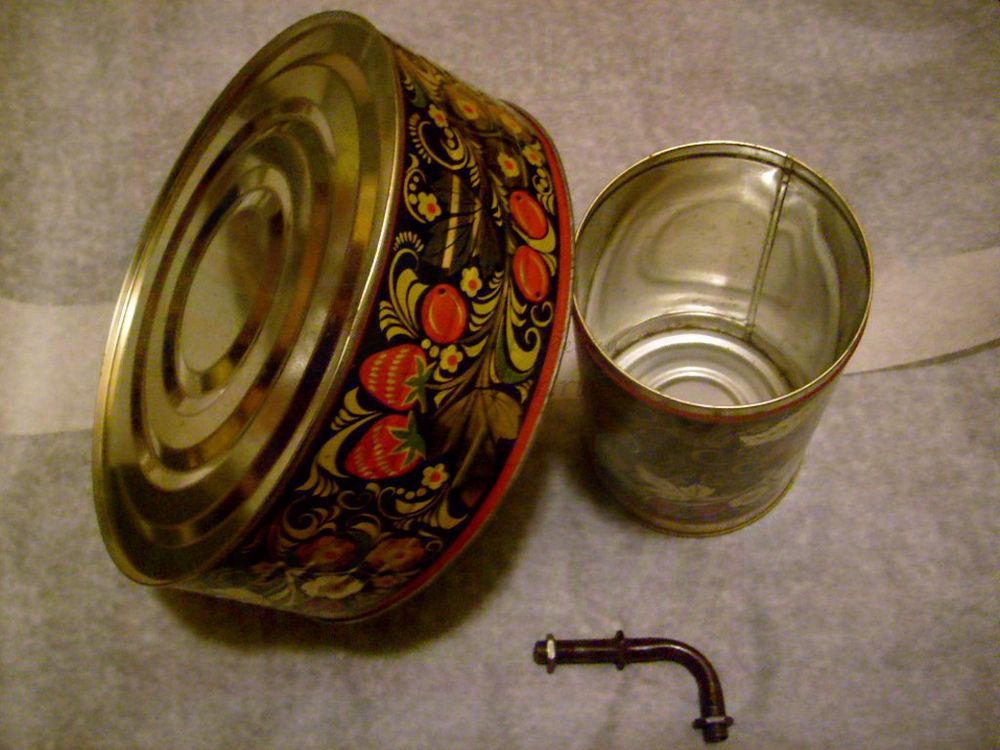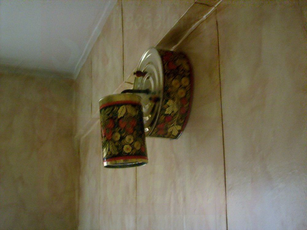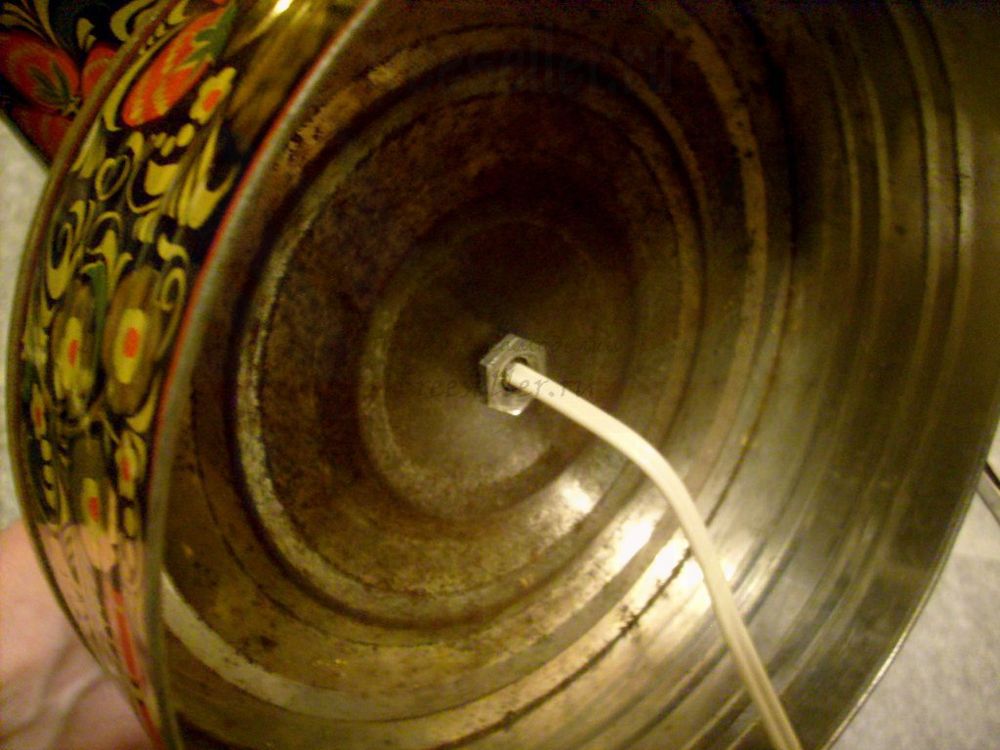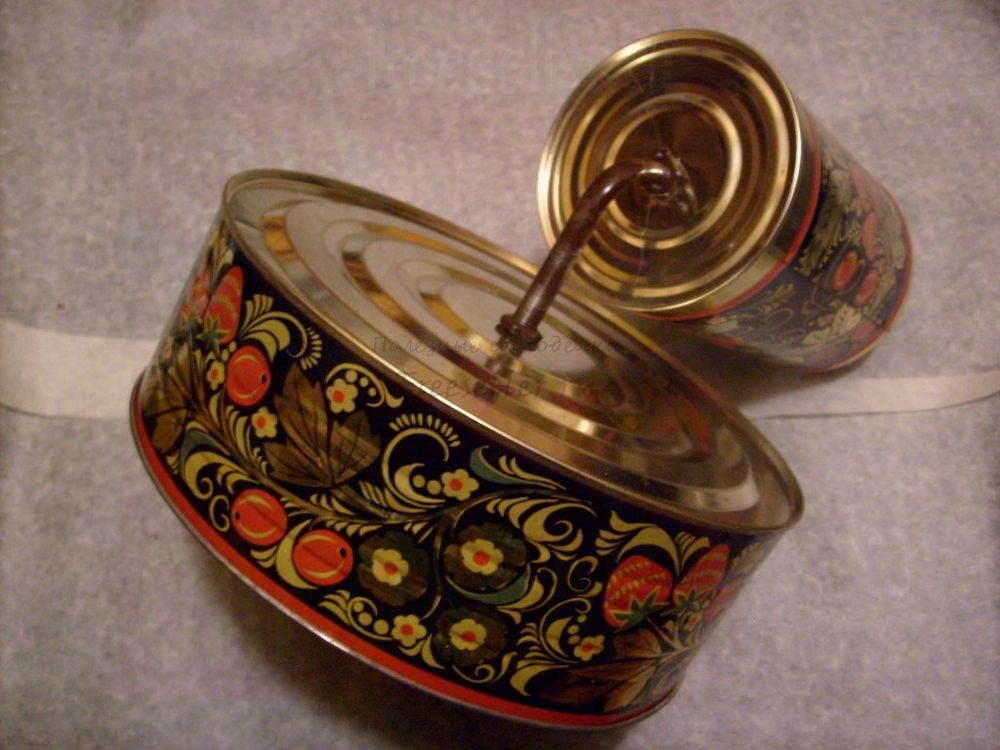 Жестяные банки с хохломской росписью, отслужившие своё и испорченные изнутри коррозией, могут пригодиться вам в другом качестве. Из них выйдет оригинальный настенный светильник, особенно подходящий для кухни. Большая широкая банка станет основанием и, кстати, позволит нам закрыть место выхода проводки наружу. Плафон же мы соорудим из узкой высокой банки. Кроме них, нам понадобятся электрический патрон, провод, изолента, четыре гайки, два длинных шурупа и полая трубка с резьбой для крепления банок друг к другу.
