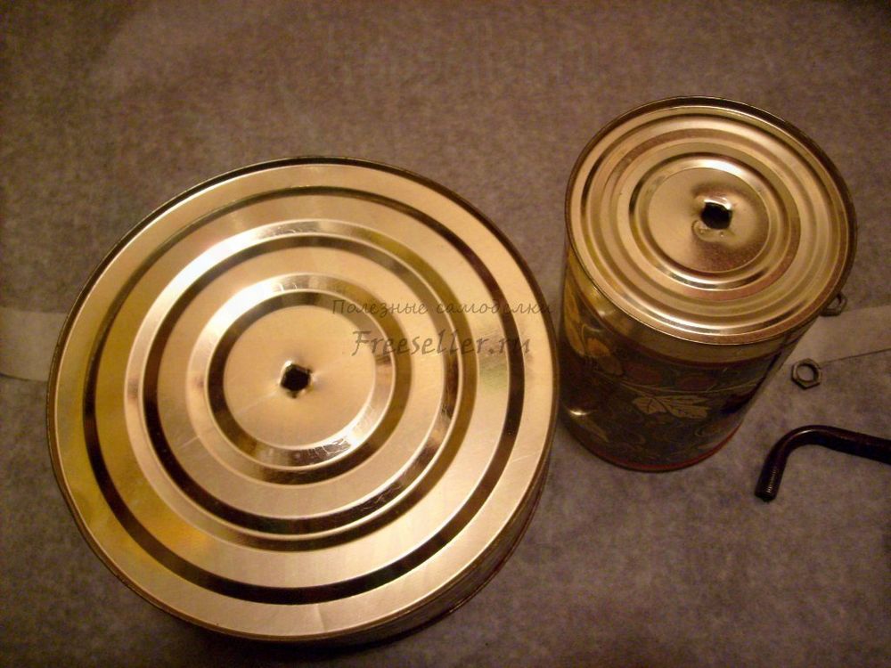 1. В дне обеих банок по центру пробиваем отверстия нужной величины.