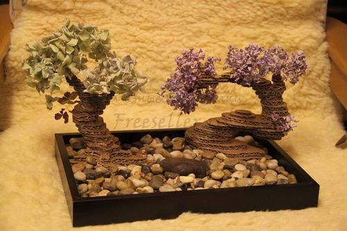 Готовое дерево устанавливаем в коробку, сверху приклеиваем сухие цветы сирени или флокса, укладываем вокруг камни.