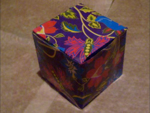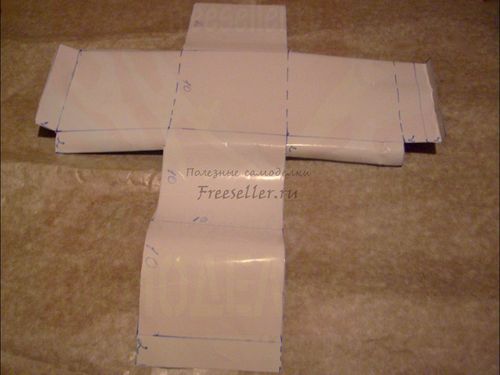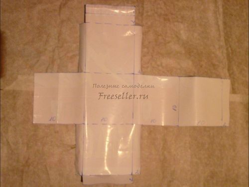 1. Разрезаем пакет. Строим на тыльной стороне его стенки чертёж коробки. Наша будет кубической формы с рёбрами 10 на 10 см. Вырезаем её.