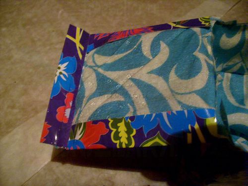 Промазываем клеем внутреннюю поверхность крышки вместе с поролоном и приклеиваем тканную подкладку. Промазываем отвороты крышки и приклеиваем их вовнутрь, пряча срезы подкладки.