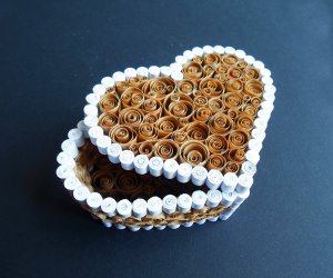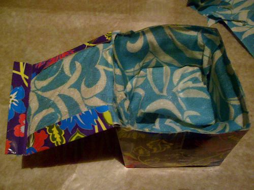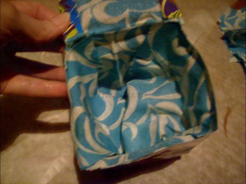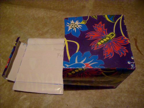 Хорошо промазываем клеем внутреннюю часть коробки у верхнего края, а стенки и дно промазываем слегка и фрагментарно. Приклеиваем подкладку точно вдоль верхних краёв коробки и закрывая срез подкладки крышки, но произвольно, с напусками по дну и стенкам.
