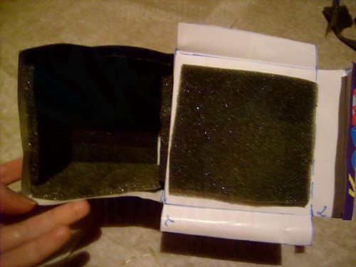 5. Промазываем стенки, дно и крышку коробки изнутри клеем и крепим к ним поролоновые квадраты.
