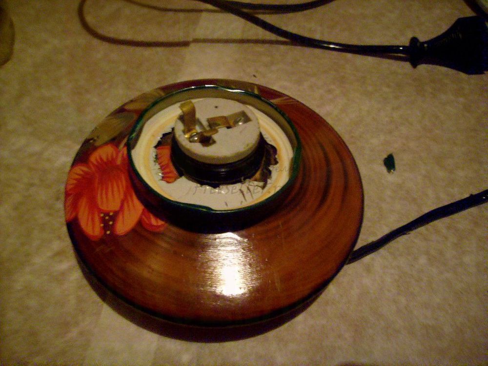 1. Прорезали в крышке отверстие. Дырявится составляющий её материал легко. Но резать его трудно - скользит и крошится. Отверстие получилось неровное. Что оказалось к лучшему. Мы надели крышку на цоколь патрона, и она зубцами плотно зацепилась за него. Не пришлось даже прикручивать её шурупами.