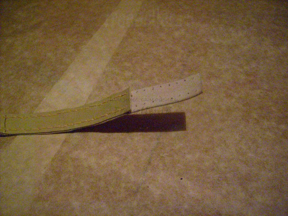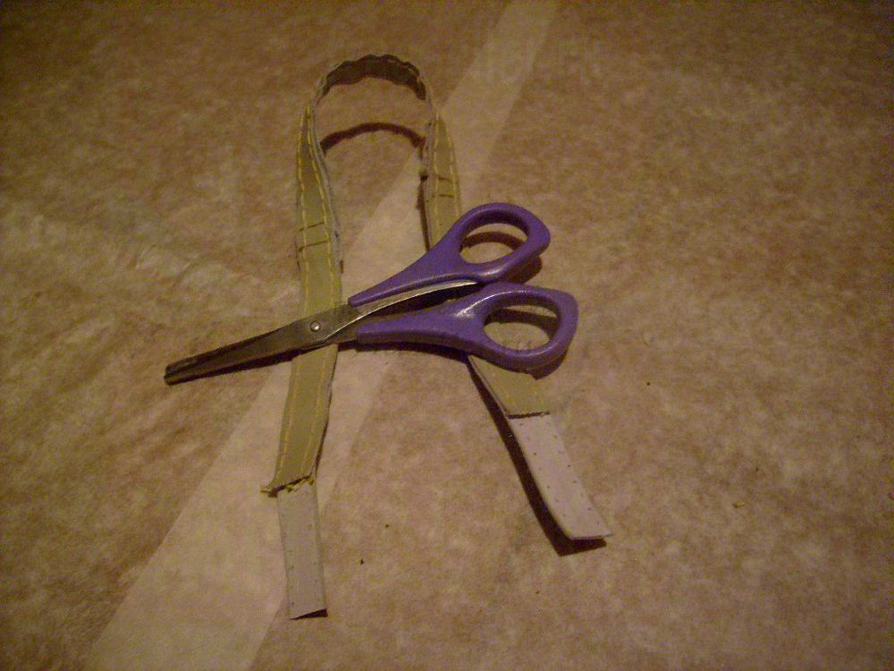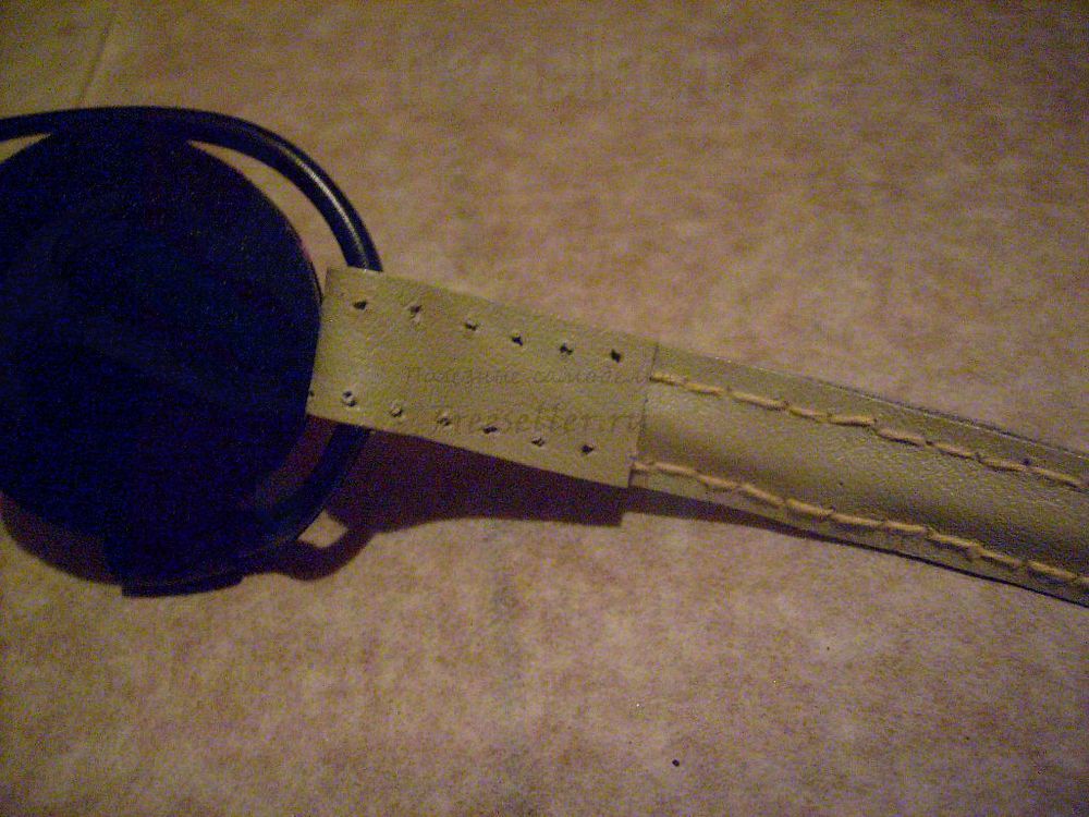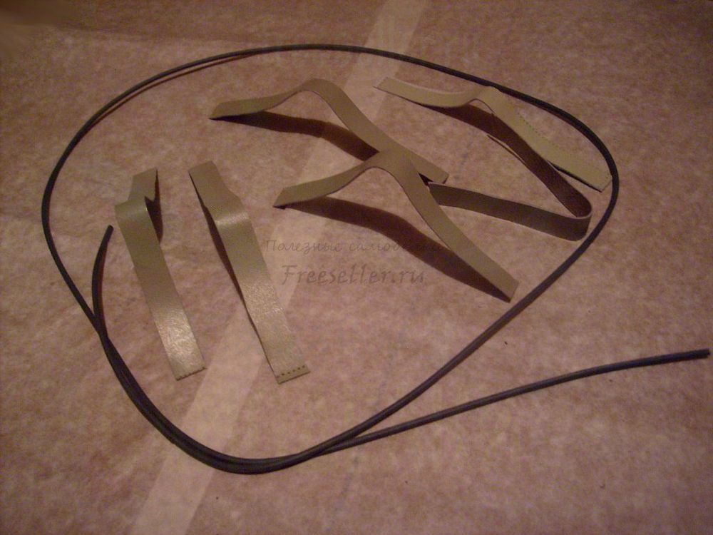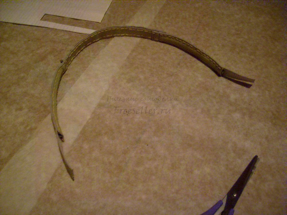 1. Рассчитываем длину дужки, измерив расстояние между ушами через макушку. Нарезаем полоски кожи (например, из старых кошельков) с запасом в 1 см на стыковые швы по длине и 1,5 см шириной.