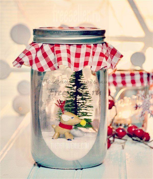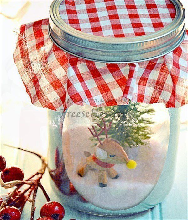 5.Теперь вам останется положить внутрь соль и игрушки или сувениры, напоминающие о Рождестве и Новом Годе. Также накройте банку подходящей тканью и оденьте крышку или резиночку.