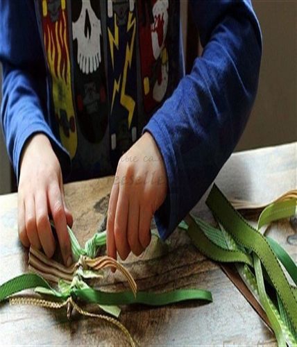 2.Подрежьте ленточки, так чтобы получилась форма, напоминающая ёлку. Обработайте концы ленточек спичкой, чтобы они не рассыпались.