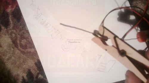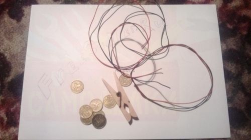 Теперь берем прищепку и две монеты 50 копеек, и провод плюсовой от источника питания - подключаем как на фото.