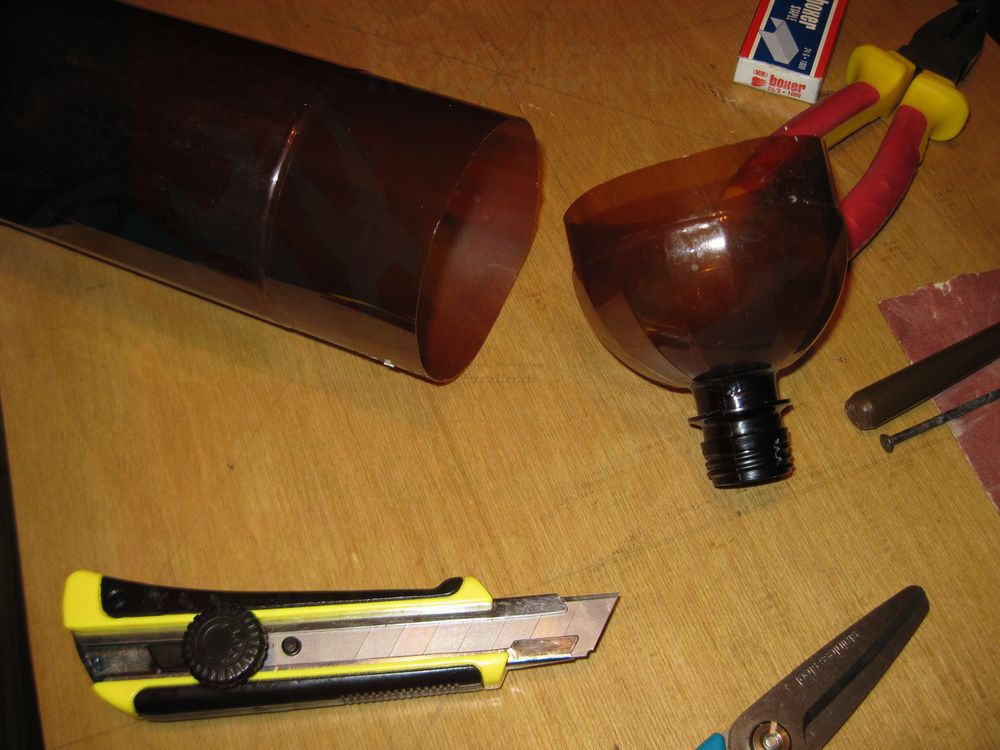 Итак, у нас получился корпус нашей будущей кормушки. Кто-то может спросить, зачем нам понадобилось вставлять перевернутую горловину в корпус бутылки, можно ведь было обойтись и без нее.