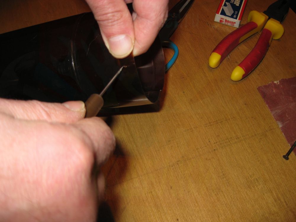 Эти отверстия лучше делать не шилом, а проплавить гвоздиком, поскольку проплавленные в пластике отверстия выходят более прочные чем проколотые, а также более чистые (то есть они, как правило, не заплывают и не разлохмачиваются как проколотые).